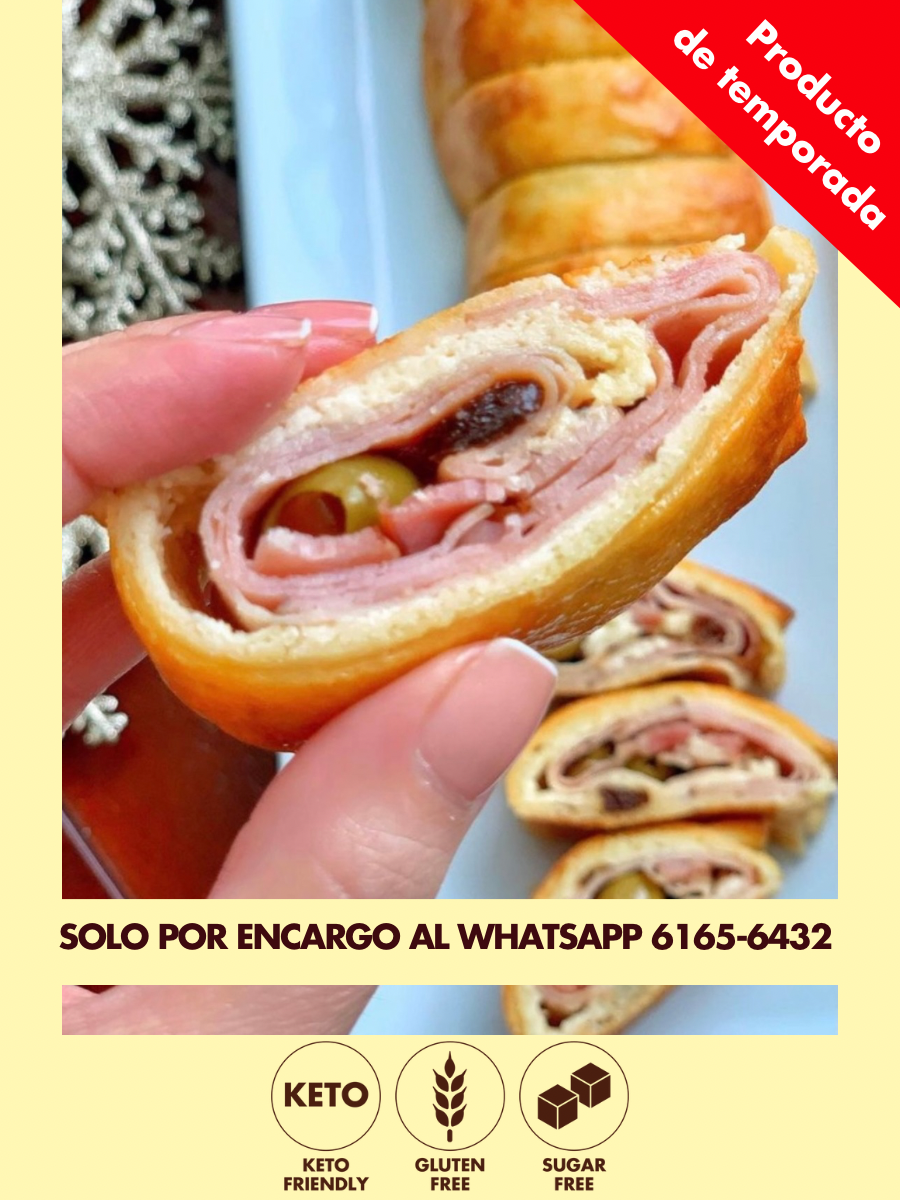 Uno de nuestros BEST SELLER en época navideña. Se trata de un pan elaborado de manera artesanal y que envuelve un delicioso relleno combinado de pechuga de pavo, bacon de pavo, aceitunas y pasitas (opcional). Su sabor tan característico nos transporta a las fechas decembrinas, y la idea es que no dejes de comer los platos típicos de la época por cuidar de tu figura y salud.